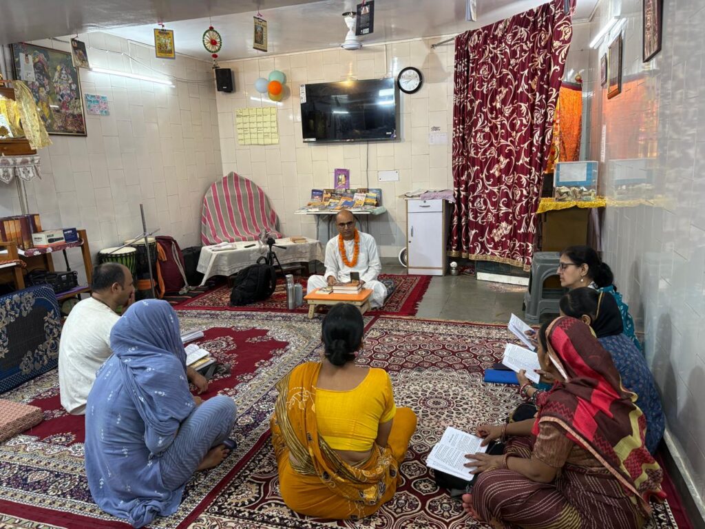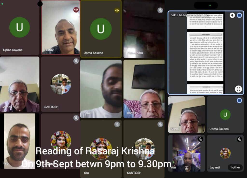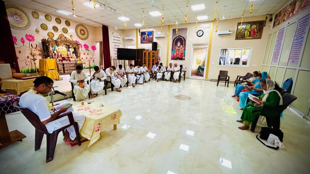 To further extend the celebration, daily online reading sessions were organized from Monday, 8th September, to Saturday, 13th September between 6 PM and 7 PM IST on Zoom. Devotees collectively read Srila Prabhupada’s books, reflecting on his instructions and sharing realizations. The online format allowed many members of the congregation to participate from their homes, creating a warm sense of community and shared inspiration.