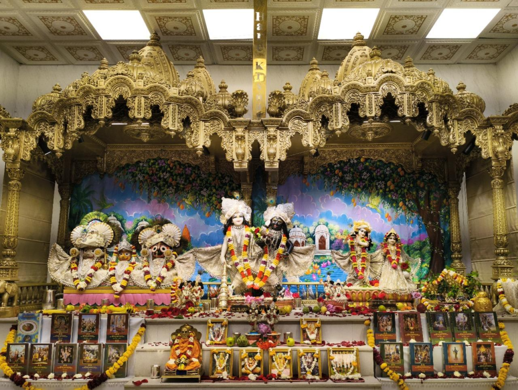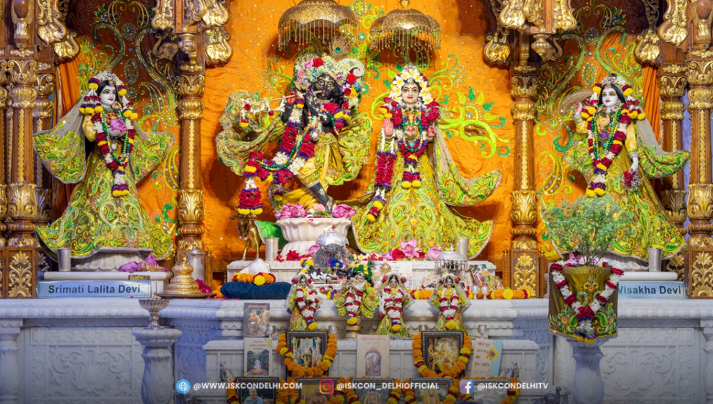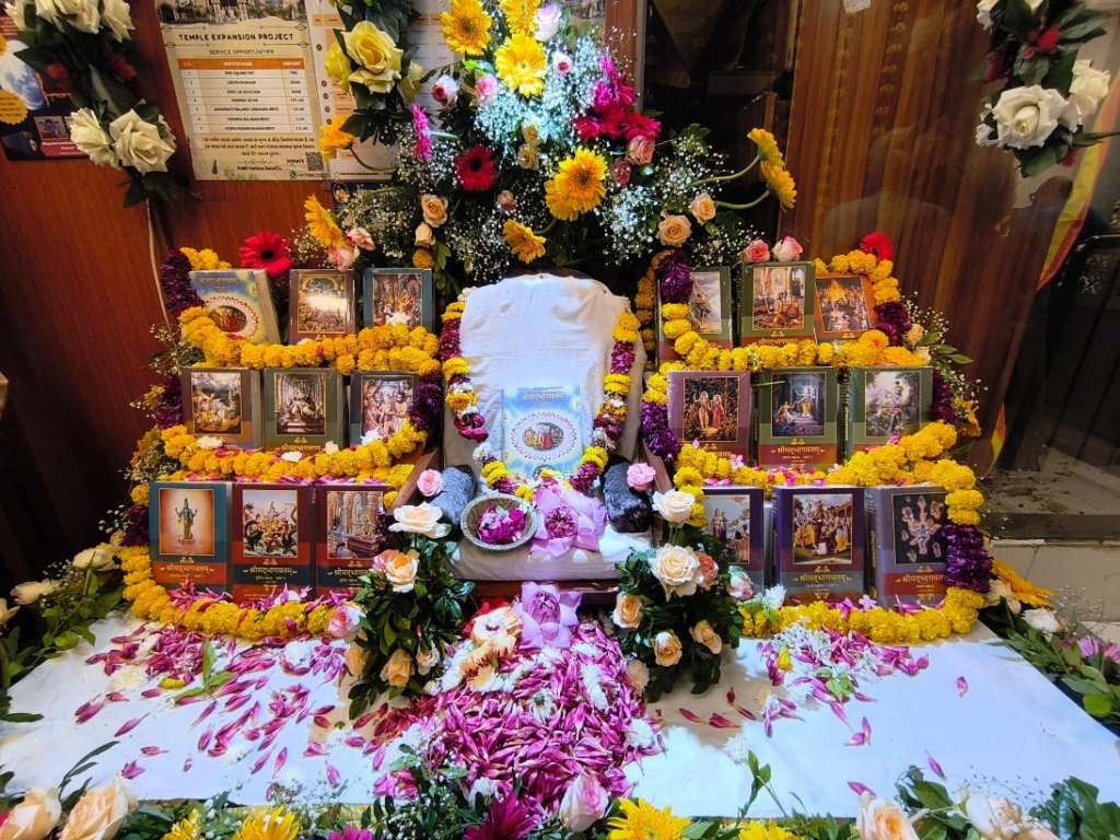 ISKCON Chattarpur, alter decorated with Srila Prabhupada’s books
